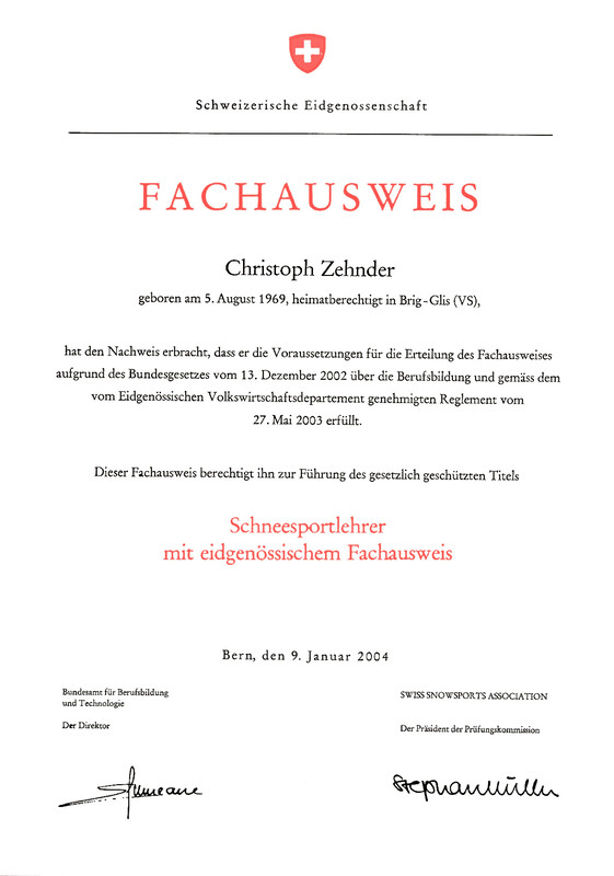 Nachdem ich in Leukerbad trainiert hatte, habe ich mich im Jahr 1997 in St. Moritz zum dipl. Skilehrer qualifiziert und im Jahr 2004 habe ich noch den Schneesportlehrer mit eidg. Fachausweis aus Bern erlangt.